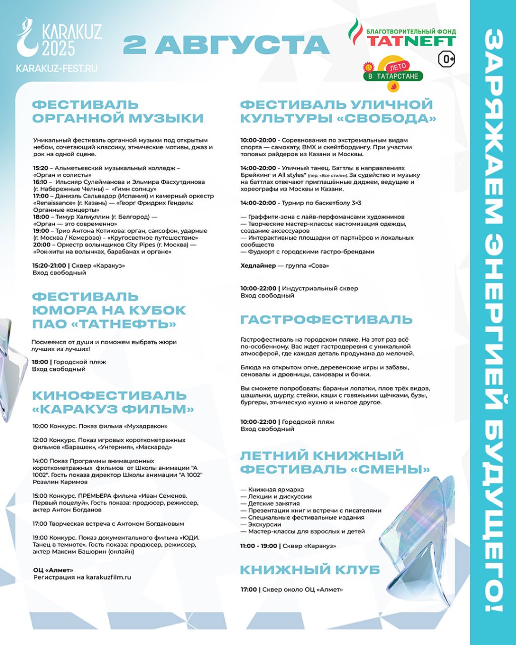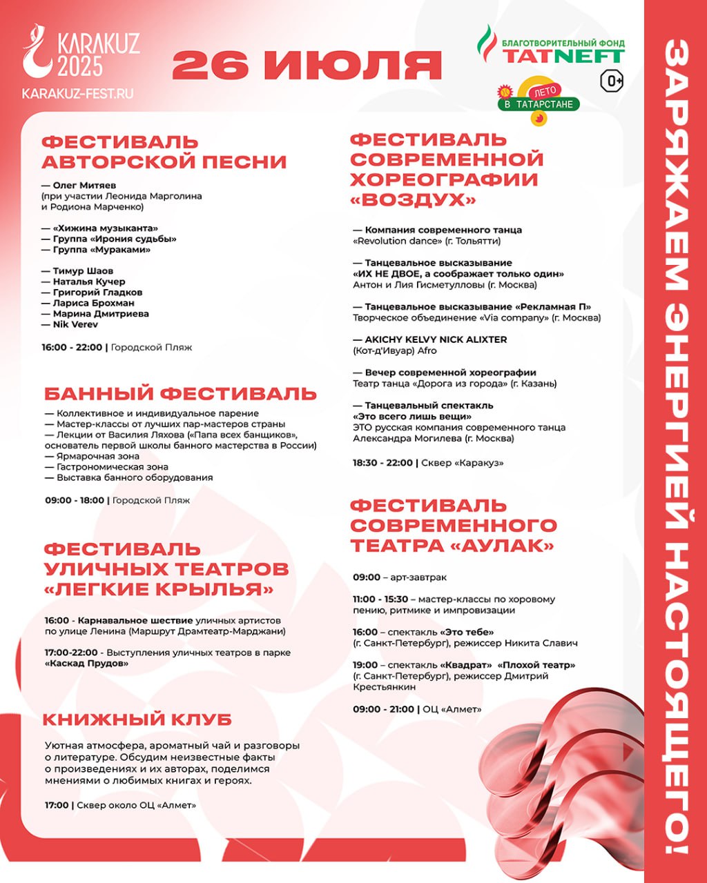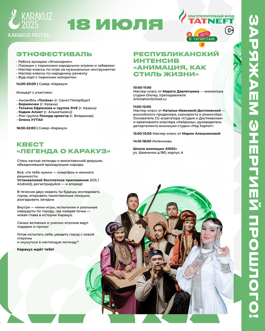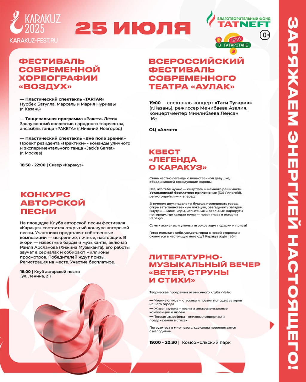 Концерт «Славься, мой Татарстан!» – это возможность окунуться в мир ярких красок, богатой истории и самобытных традиций. Вы услышите проникновенные лирические песни, зажигательные танцевальные ритмы, прославляющие красоту татарской земли и ее талантливых людей.